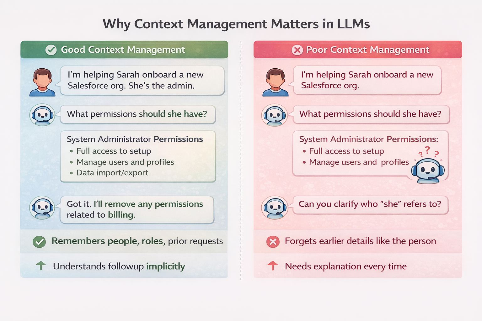 For simpler implementations, you can achieve a level of "Good" context management by essentially passing conversation history, however there are context limits with almost all production LLM implementations (size and cost) and may generally fail for required custom agent solutions.