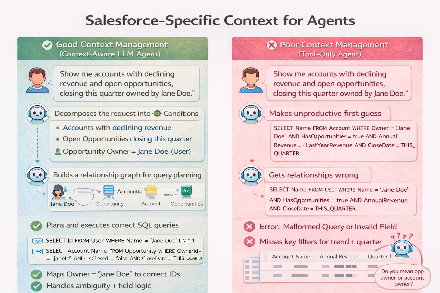 The Salesforce example illustrates the broader point behind these takeaways. A naive LLM, even with tool access, cannot reliably answer cross-object business questions without context. By externalizing schema awareness, relationship traversal, and query planning into explicit system components, we can transform a generic LLM into a reliable Salesforce analyst, without increasing model complexity. This pattern generalizes to any system built on relational data and defined schemas.